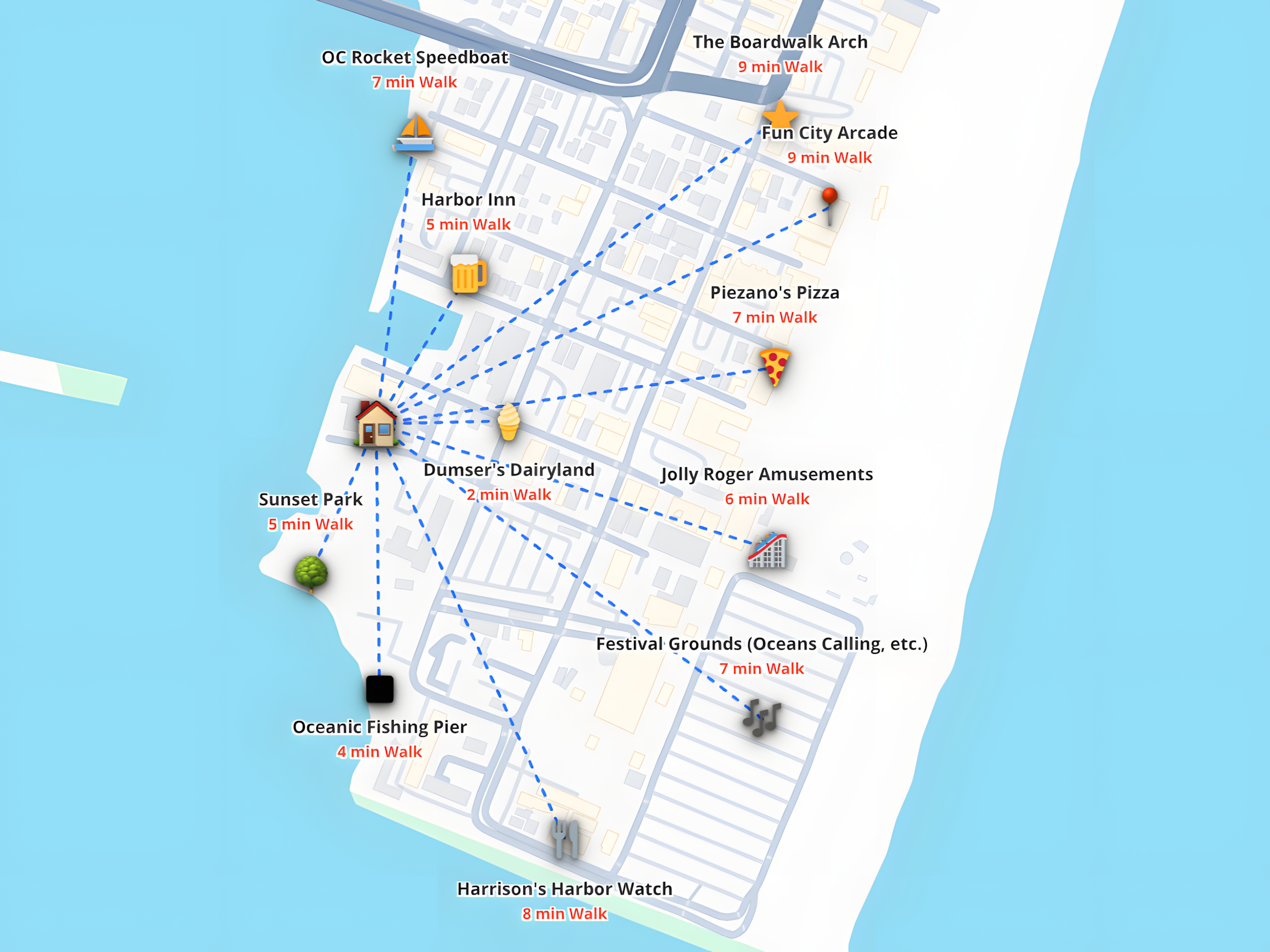 OUTDOOR EXCURSIONS: Sunset Park (0.1 miles), Ocean City Beach (0.9 miles), Surf Ave Beach (1 mile), Paradise Watersports (2 miles), Odyssea Watersports (4 miles), Northside Park (8 miles) ACTIVITIES: Ripley’s Believe It or Not! (0.2 miles), Oceanic Fishing Pier (0.2 miles), Ocean City Life-Saving Station Museum (0.9 miles), Ocean City Boardwalk (1 mile), Embers Island Mini Golf (2 miles) ROLLER-COASTER RIDES: Jolly Roger at the Pier (0.7 miles), Baja Amusements (2 miles), Viking Golf & Go-Karts (9 miles) AIRPORTS: Salisbury-Ocean City Wicomico Regional Airport (28 miles), Baltimore/Washington International Thurgood Marshall Airport (139 miles)