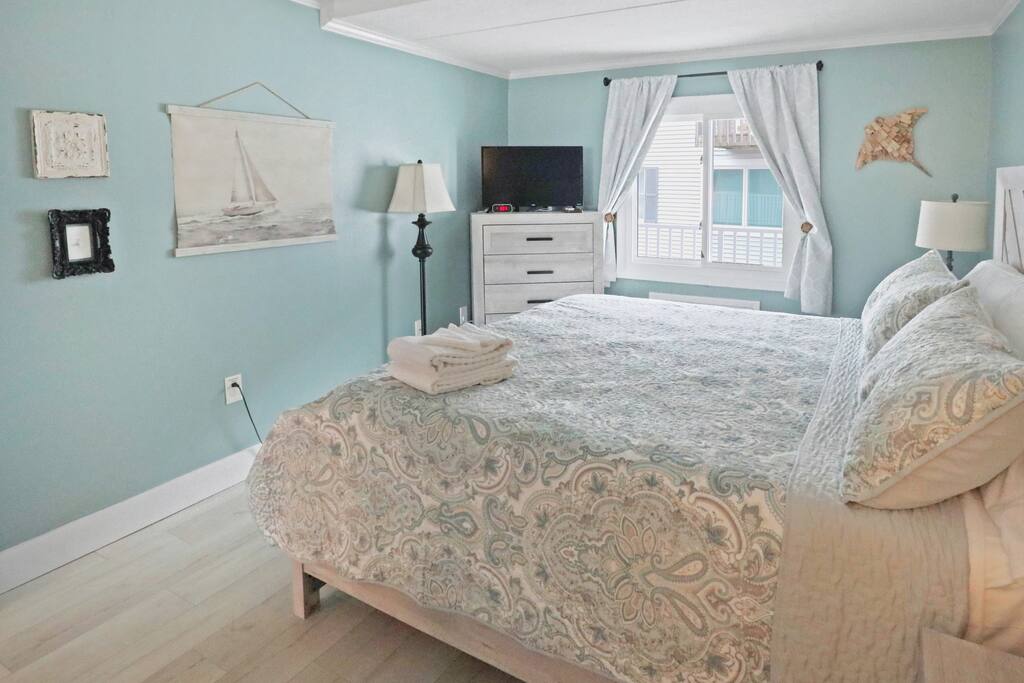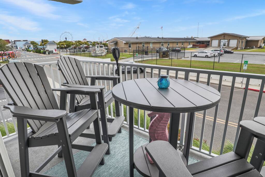 Furnished Balcony | Elevator Available | Central Location | In-Unit Laundry | Seasonal Community Outdoor Pool (Depth 3'-6') Whether you’re planning a romantic beach retreat with your significant other or an ocean vacation with your best friends, this condo is the perfect home base. Bedroom: King Bed | Living Room: Queen Sleeper Sofa INDOOR LIVING: Smart TVs w/ complimentary Netflix & Hulu, Blu-Ray Player, retro Atari & Nintendo game systems, board games, books, phone-charging station OUTDOOR LIVING: Furnished balcony, dining area, water views of the bay and inlet (home base of the Coast Guard) KITCHEN: Refrigerator, stove/oven, dishwasher, dishware/flatware, cooking basics, spices, Keurig coffee maker, blender, Crockpot, microwave, toaster, water filter GENERAL: Free WiFi, keyless entry, 2 A/C wall units, electric heating, washer/dryer, linens/towels, laundry detergent, trash bags, paper towels, hair dryer FAQ: Step-free access, elevator on-site, Ring doorbell & exterior security camera (facing out) PARKING: Reserved space in the building's parking lot (1 vehicle)