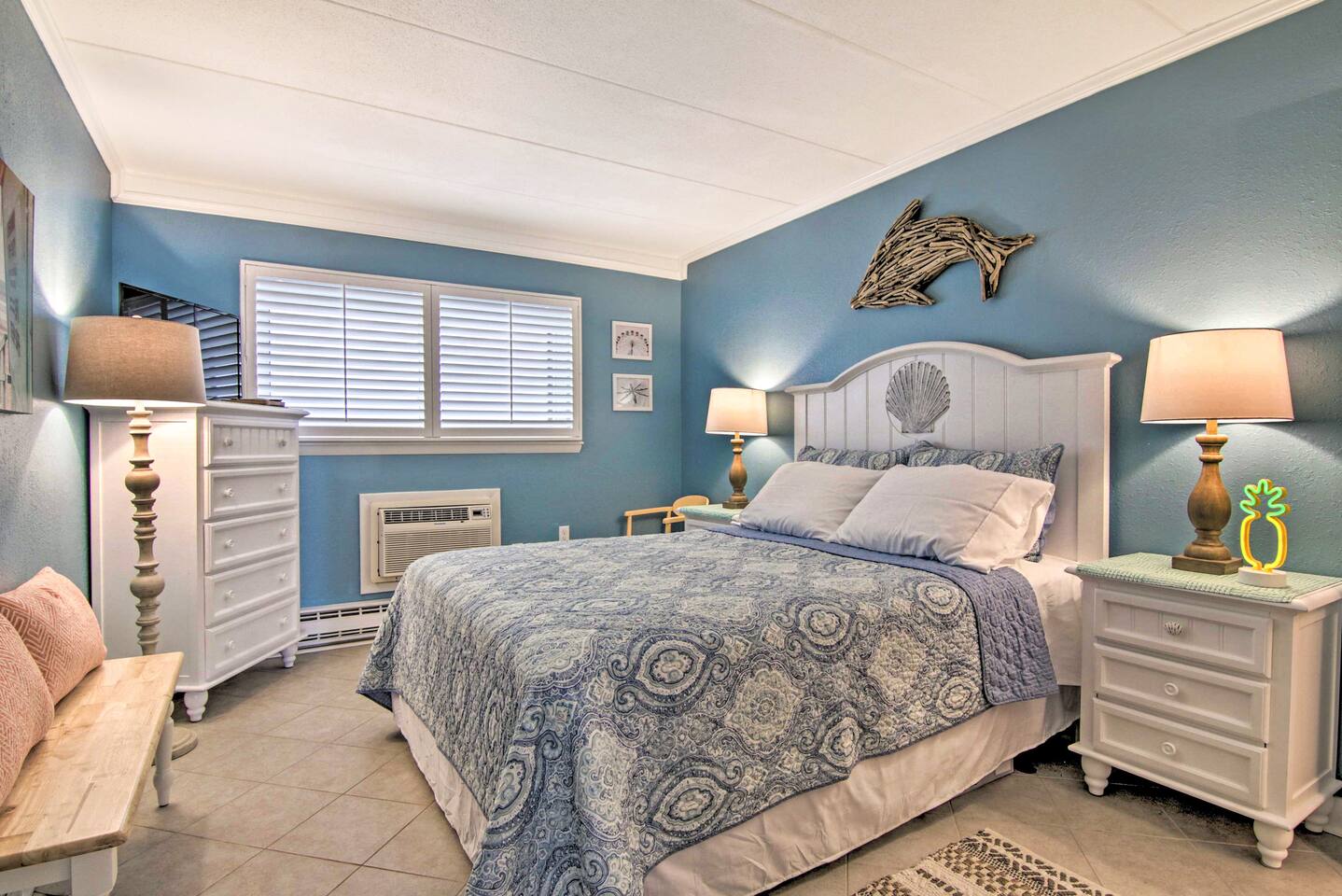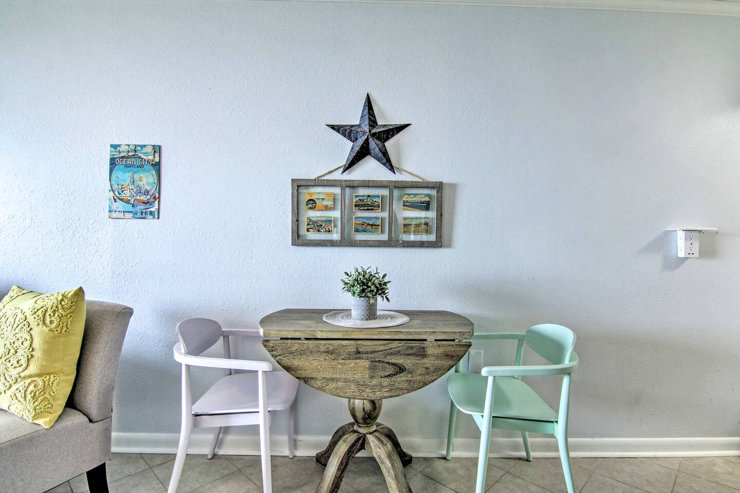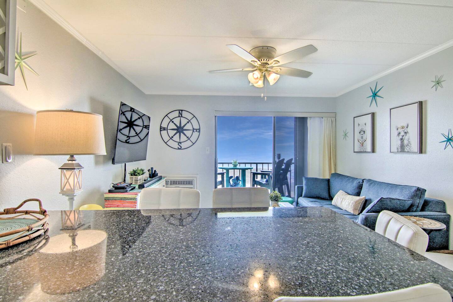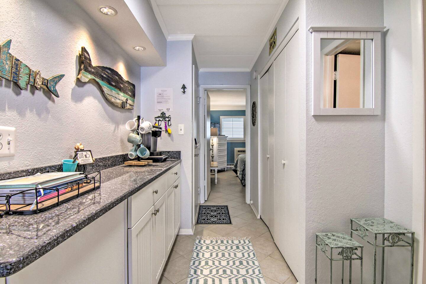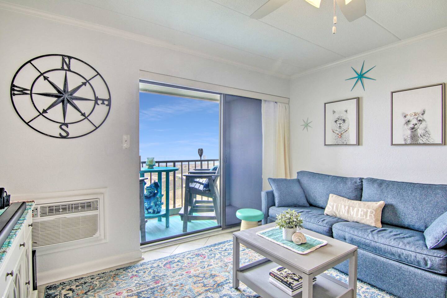 Furnished Balcony | Elevator Available | < 1 Mile to Local Eats Whether you’re planning a romantic beach retreat with your significant other or an ocean vacation with your best friends, this condo is the perfect home base. Bedroom: Queen Bed | Living Room: Full Sleeper Sofa w/ Gel Memory Foam Mattress INDOOR LIVING: Smart TVs w/ complimentary Netflix & Hulu, Blu-Ray Player, retro Atari & Nintendo game systems, board games, books, phone-charging station KITCHEN: Fully equipped, cooking basics, dishware/flatware, Keurig coffee maker, blender, toaster, Crock-Pot GENERAL: High-speed free WiFi, 2 A/C wall units, washer/dryer, keyless entry, linens, bath towels (beach towels not provided) FAQ: 2 exterior security cameras (facing out) SUITABILITY: 2nd-floor unit, 1 flight of steps required for entry, shared elevator available once inside PARKING: Designated parking spot (1 vehicle), additional shared parking spaces (multiple vehicles)