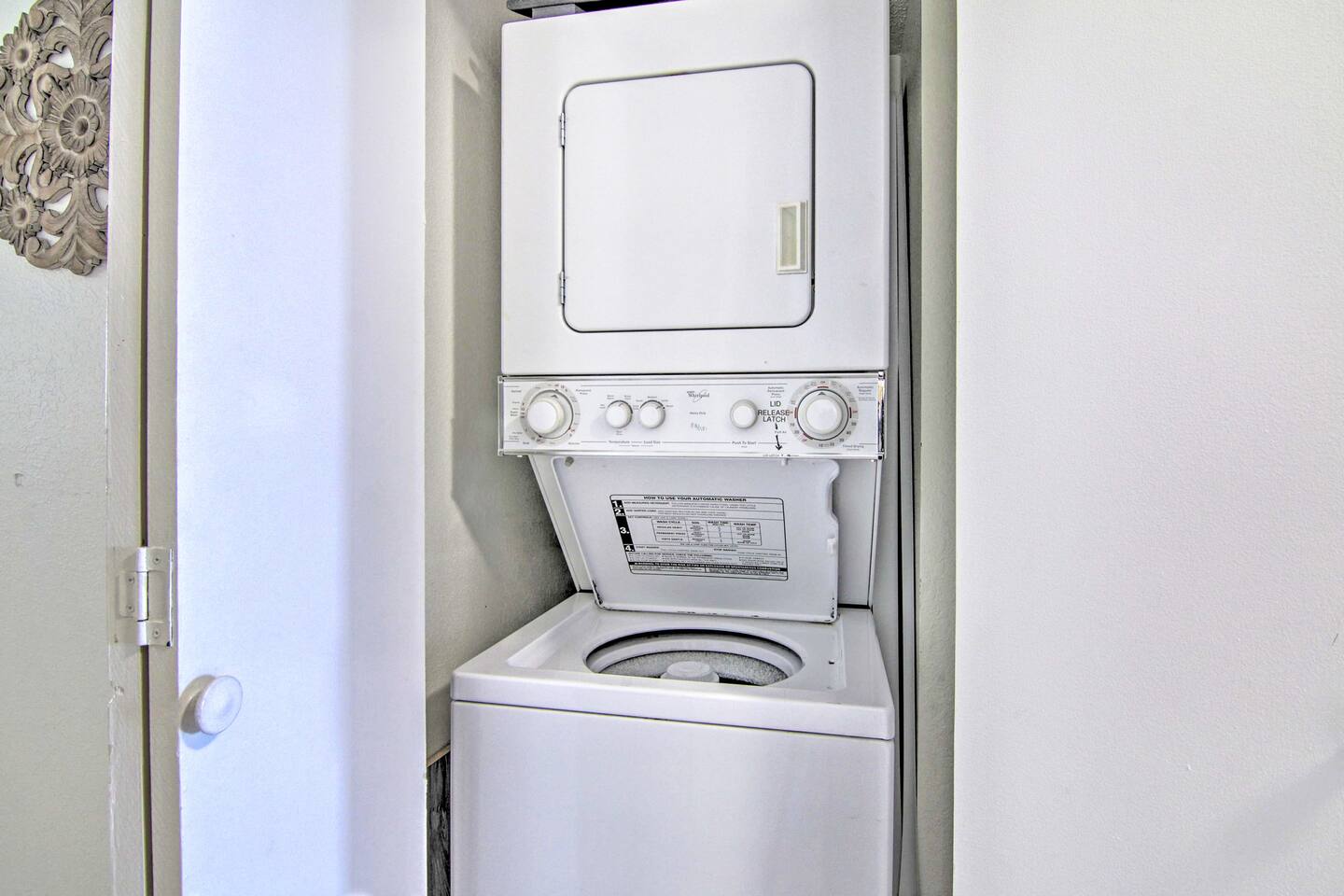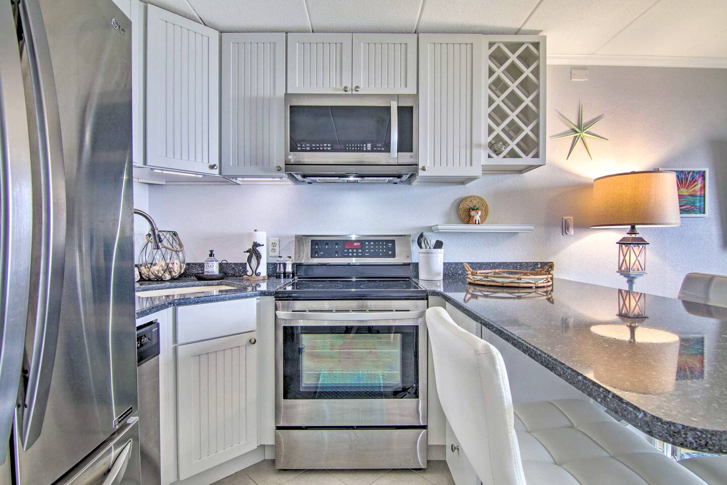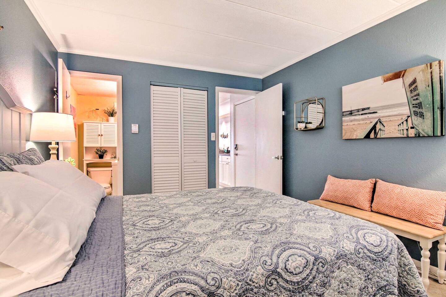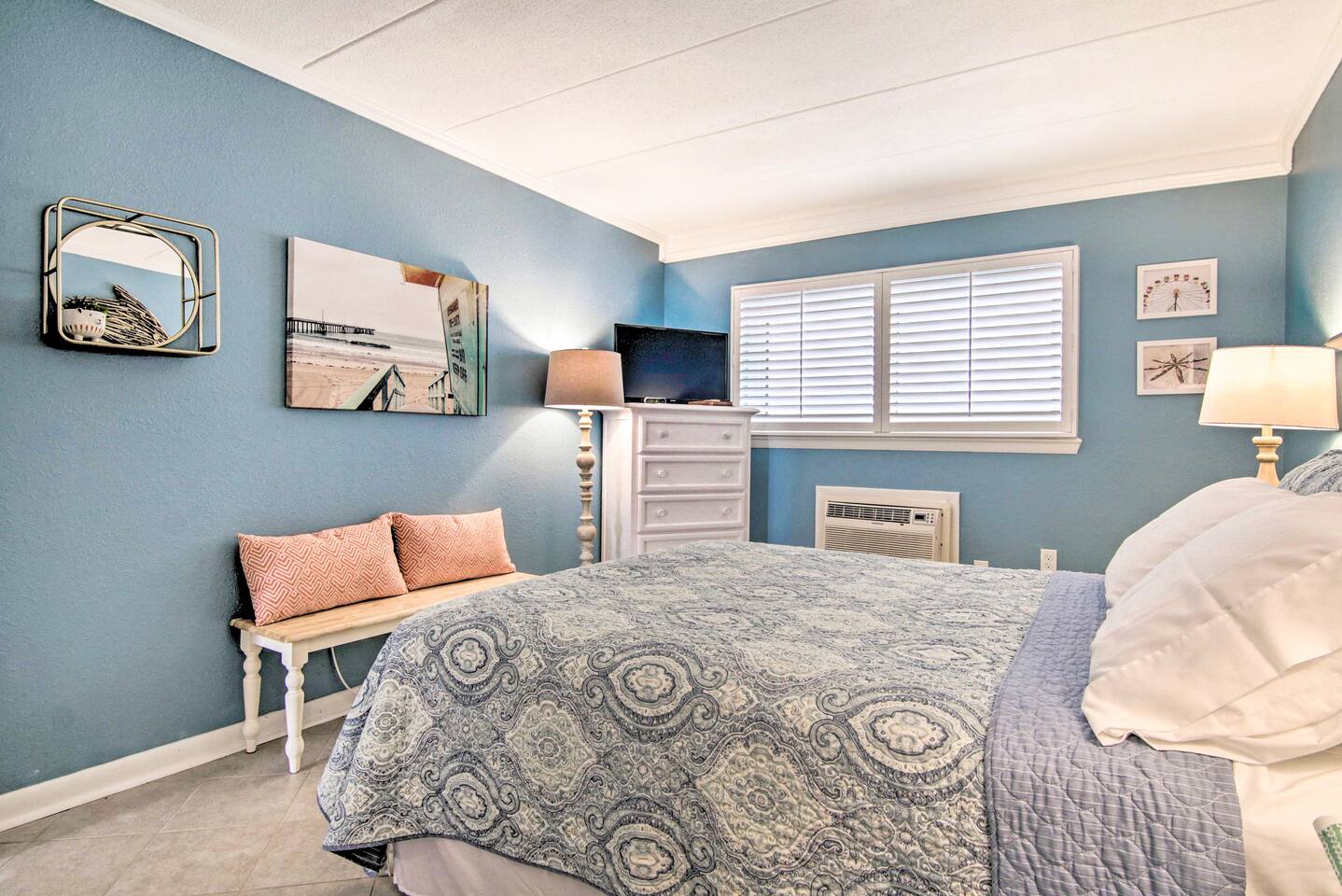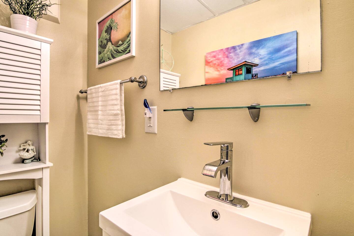 Furnished Balcony | Elevator Available | < 1 Mile to Local Eats Whether you’re planning a romantic beach retreat with your significant other or an ocean vacation with your best friends, this condo is the perfect home base. Bedroom: Queen Bed | Living Room: Full Sleeper Sofa w/ Gel Memory Foam Mattress INDOOR LIVING: Smart TVs w/ complimentary Netflix & Hulu, Blu-Ray Player, retro Atari & Nintendo game systems, board games, books, phone-charging station KITCHEN: Fully equipped, cooking basics, dishware/flatware, Keurig coffee maker, blender, toaster, Crock-Pot GENERAL: High-speed free WiFi, 2 A/C wall units, washer/dryer, keyless entry, linens, bath towels (beach towels not provided) FAQ: 2 exterior security cameras (facing out) SUITABILITY: 2nd-floor unit, 1 flight of steps required for entry, shared elevator available once inside PARKING: Designated parking spot (1 vehicle), additional shared parking spaces (multiple vehicles)