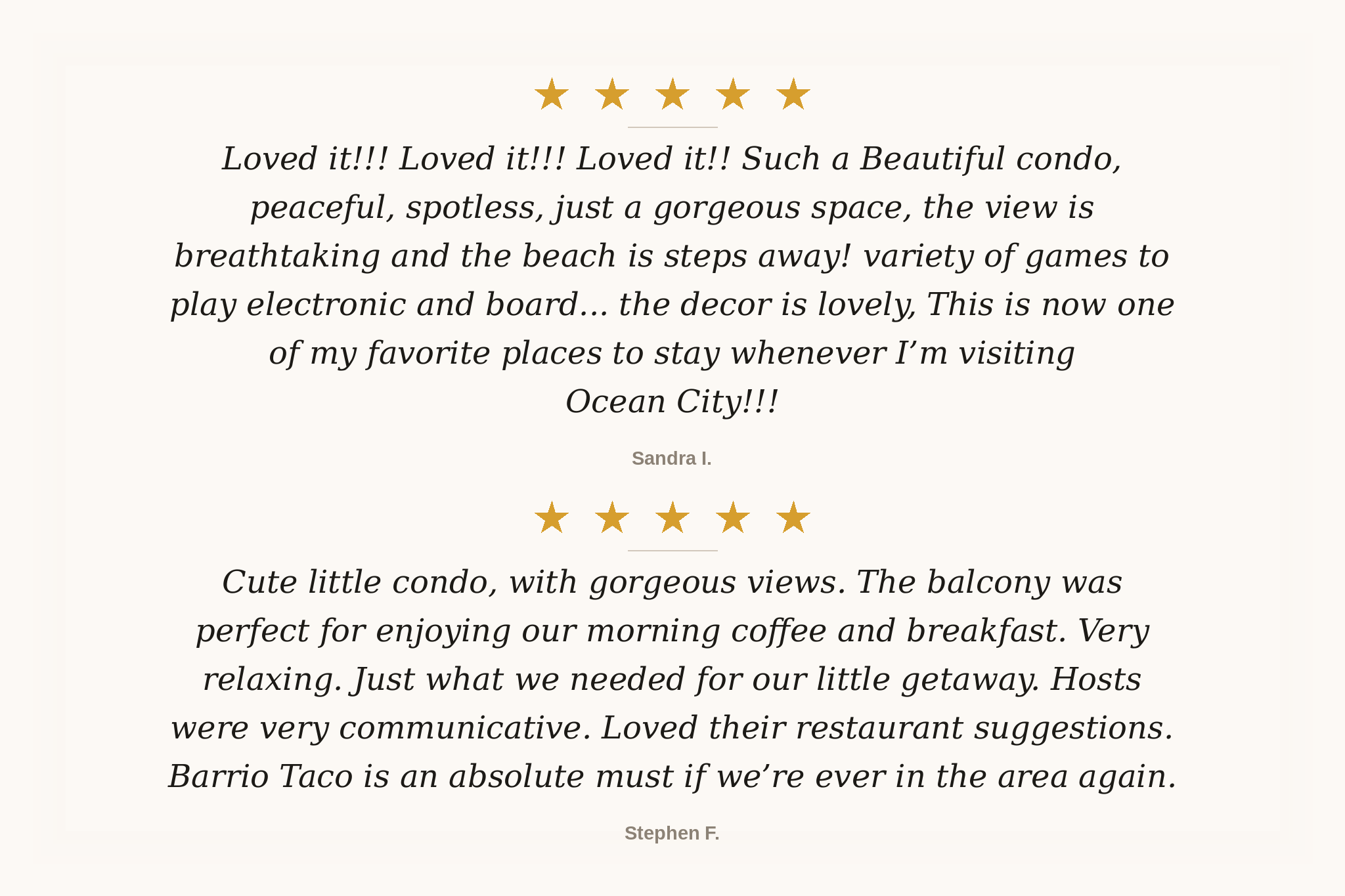 "We believe every stay should be effortless and memorable. Our Ocean City condos offer comfort, whimsical style and local charm. From smooth check‑ins to thoughtfully stocked homes, we focus on the details that make travel stress‑free. We love sharing insider tips so you can experience OC like a local. Whether you're here for a family vacation or a couple's getaway, book with confidence knowing that you'll feel right at home the moment you arrive." — Your Hosts, Tom & Melena